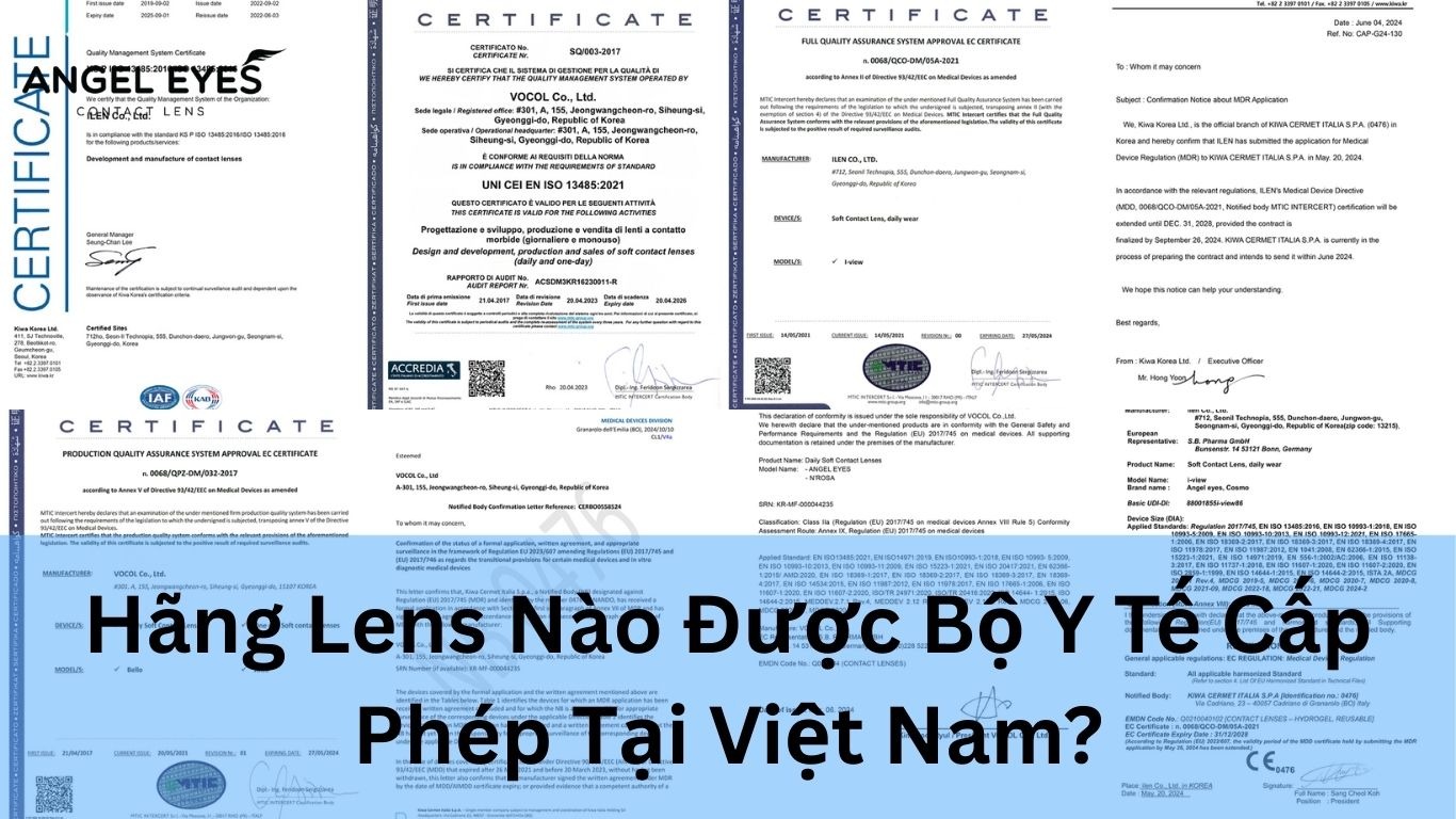 Hãng lens nào được Bộ Y tế cấp phép là câu hỏi quan trọng mà người dùng kính áp tròng cần biết trước khi mua. Kính áp tròng thuộc nhóm trang thiết bị y tế loại B, yêu cầu phải có Văn bản công bố tiêu chuẩn áp dụng từ Bộ Y tế Việt Nam theo Nghị định 98/2021/ND-CP có hiệu lực từ 01/01/2022. Angel Eyes là một trong những thương hiệu lens được Bộ Y tế cấp phép đầy đủ, sở hữu chứng nhận ISO 13485, CE Marking, và các giấy tờ nhập khẩu hợp pháp từ iLen Korea và Vocol Korea.